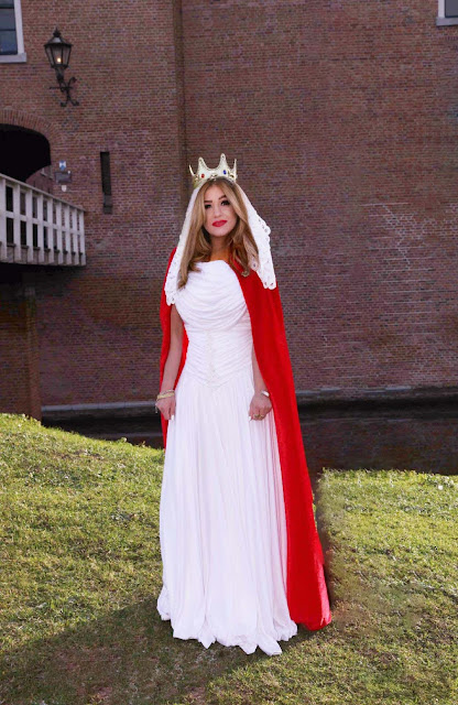Para acercarme al vestuario de Isabel en una forma moderna, elegí un vestido blanco, estrecho con corset, largo como los usados por las mujeres de la realeza de aquel período, una capa roja con un broche, otra joya que Isabel utilizaba, un velo blanco y una corona dorada.